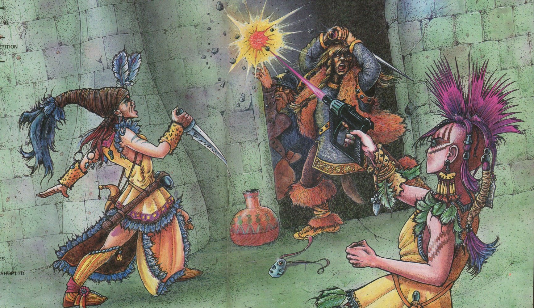 The Amazons of Warhammer were introduced in The Second Citadel Compendium (1984), the cover of which features dramatic wrap-around cover art by John Blanche, whose blistering drawings still forge the imagery of the game today. Depicted are pink-haired, non-sexualized, technologically-advanced lesbians defending their lands from scruffy, furry-booted, patriarchal Norse invaders. The Compendium‘s scenario Rigg’s Shrine, written by Richard Halliwell, goes some way in detailing Amazon society: entirely female, living peacefully beside the Old Slann, becoming custodians of their advanced alien technology after the Slann Empire fell. The scenario sets up a gendered dichotomy between the devoutly religious, peaceful, and advanced feminine Amazons with a brutish, aggressive, masculine group of Norse Raiders.