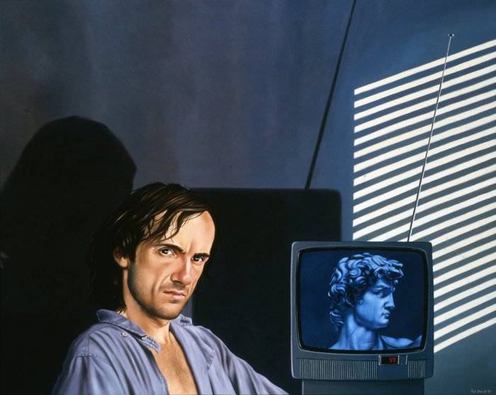 Roberts, who trained at Newport, Cardiff and Goldsmiths Colleges of Art, was included in the Superhumanism art movement by the movement’s originator, author and curator Nicholas Treadwell, who exhibited Roberts’ work in his London gallery, claiming—somewhat disingenuously—that Superhumanism was “a movement, first and foremost, inspired by life, as opposed to inspired by art.” Roberts’ work was also featured on the covers of books and the records of Sniff ‘n’ the Tears, the band he fronted, and whose best-known song remains the 1977 single “Driver’s Seat.” The track was the first on the band’s 1981 Love/Action LP, with cover art featuring Roberts’ painting of the same name, a lush assemblage of the kind of iconography that would retrospectively come to be considered synonymous with the 1980s.