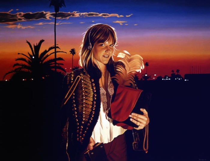 In the tradition of the Photorealism and Hyperrealism movements that had evolved as offshoots of Pop Art, the paintings of musician, songwriter, and figurative painter Paul Roberts exist in the liminal space between perceived glamor and kitsch, taking their cues from the archetypes of genre fiction and the heightened realities of cinema and photography. The distinctive use of color and the exaggerated “realism” adopted by British artist Roberts, who first came to public attention in the 1970s, serve to emphasize the artificiality of his images. Their compositions echo the mannered poses and unnatural lighting of both renaissance art—especially the Neoclassicist pastiches that flourished in the 19th century—and of the movie publicity still, implying the dissonance and drama lurking beneath the superficially glossy surfaces of modern life.