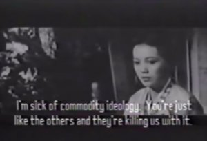 Can Dialectics Break Bricks? thus ends up being the inverse of the typical kung fu movie: the viewer ultimately ends up paying more attention to the dialogue than the fight scenes. However, the dubbed lines occasionally take notice of how the Japanese invaders and bureaucrats are the only ones to regularly wield weapons, saying that they have “the army” on their side. Whether this means the French army in ’68 or the Red Army that had brutally repressed anti-Soviet uprisings in Hungary (1956) and Czechoslovakia (1968) is left somewhat ambiguous. At the end of the final, grand fight scene, only a few of the proletarians are left standing; it is intimated that these few survivors will be left to tell the story of revolution against the oppressive state for future generations. While it’s a clear metaphor for the ’68 generation, it’s also a somewhat pacifistic statement. Throughout the film, the proletarians themselves cite the importance of ending alienation through détournement (one of many fourth-wall breaking, metafictional moments in the script). The proletarians and kung fu Situationists are ultimately not afraid to fight with chops, kicks, and swords, but it’s clear that their primary battlefield is the cultural and psychological one. In fact, the main “plot” point of the film involves what it’s like for a young revolutionary to be offered a place within the state bureaucracy, which expresses clearly how revolutionary ideas are co-opted and recuperated into the system, another crucial Situationist idea.