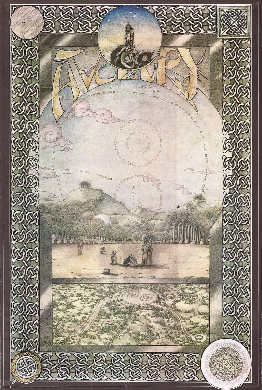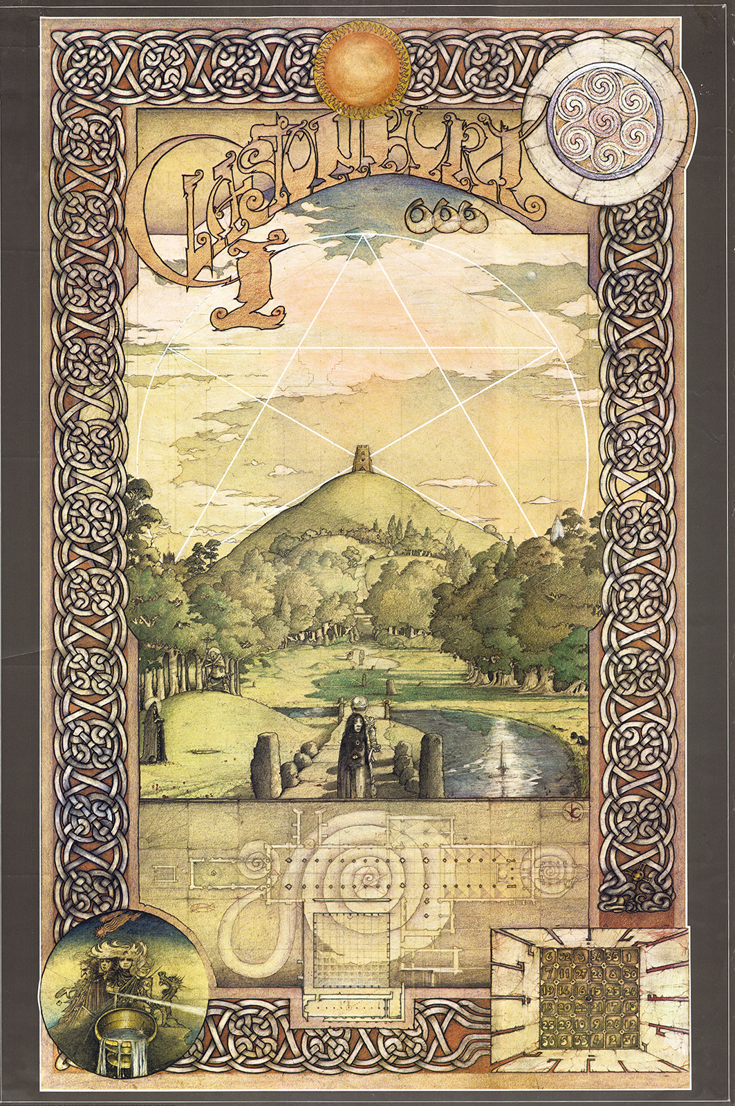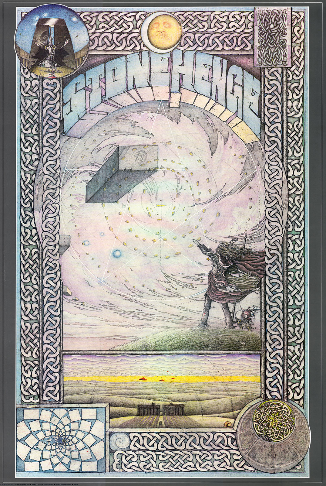 After performing at the 1992 British music industry’s awards ceremony, the BRITs, where they brought along with them grindcore punk band Extreme Noise Terror and fired machine guns loaded with blanks over the heads of the audience, the KLF disbanded, subsequently claiming to have burned a million pounds of profits and burying the “Best British Group” statuette they had been awarded at the BRITs in a field near prehistoric monument Stonehenge in righteous disgust at the clubby, inwards-looking gerontocracy of the British music industry. This was especially apt, as in 1976 Cauty had also produced a trio of beautiful posters (shown above) depicting British megalithic sites and dense with paranormal countercultural detail, the highest expression of which may be the red UFOs flying in formation above Stonehenge, and the wizard placing the great stones using the occult power of the Pentagram.