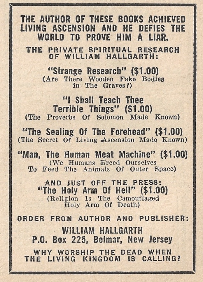William Hallgarth of Belmar, New Jersey’s advertisement is typical of the fringe Christian element in Fate; his theology was apparently a mix of American Spiritualism and old-school Gnosticism.