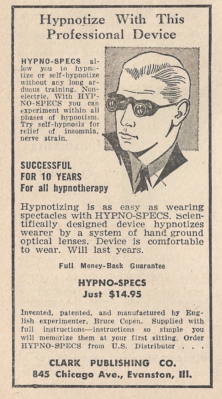 Ads for hypnosis, both self-hypnosis and hypnosis of others, abounded in this run of Fate; here Clark Publishing, Fate‘s publishing company, presents its branded “hypno-specs.”