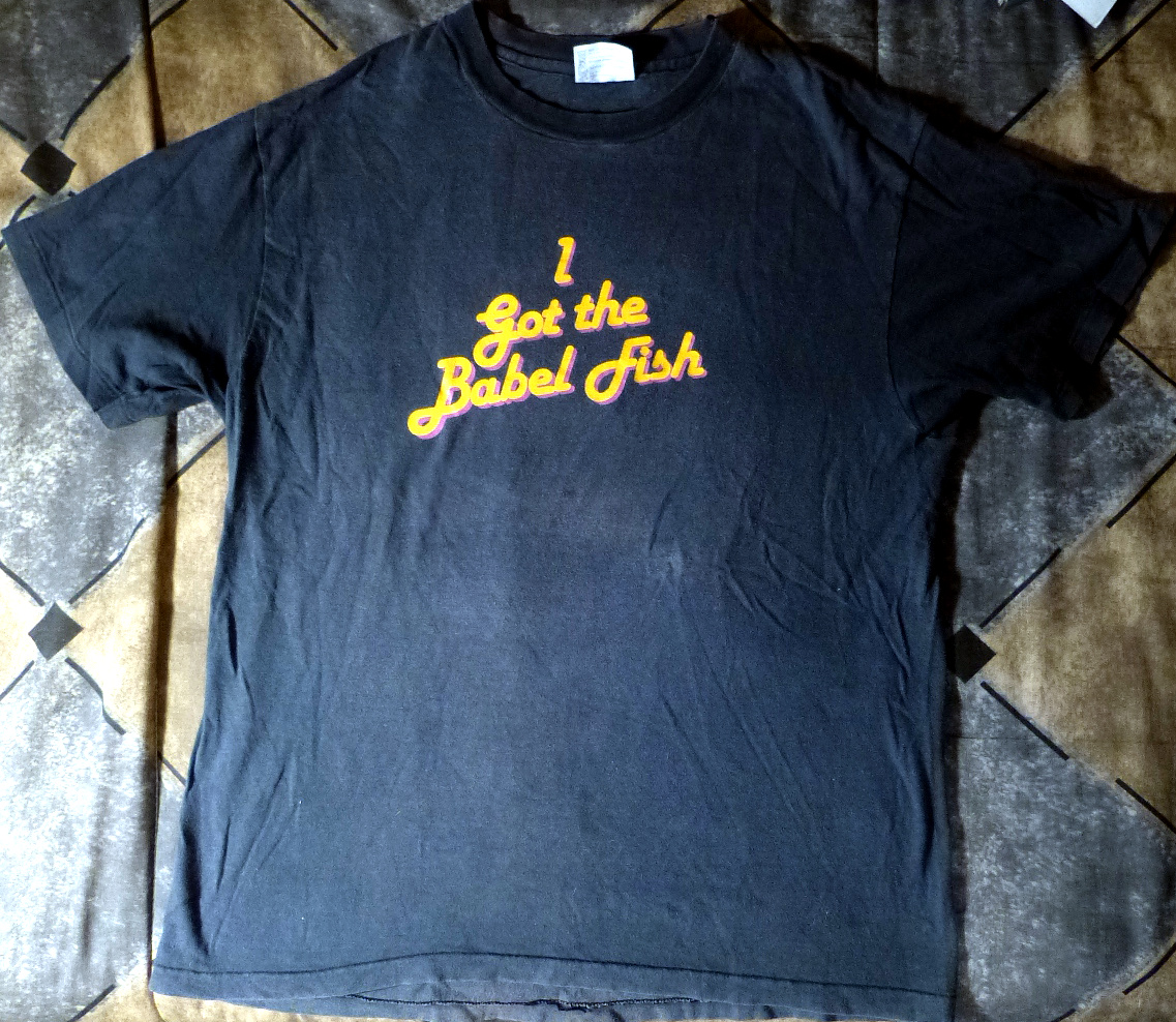 First of all, Hitchhiker’s was actually my own very first encounter with text-based interactive fiction. This format of game, exemplified by early mainframe-based games like Colossal Cave Adventure, was developed further by the minds that would eventually start Infocom at MIT in the late ’70s. The Infocom “Implementors” took interactive fiction out of university computer labs and into living rooms at the dawn of the 1980s. Their “local-boys-made-good” success made Infocom one of the signal achievements of Massachusetts’s own “miraculous” local computer industry. Infocom’s games were witty, densely-packed with in-jokes, and devilishly difficult. The tales of the Hitchhiker’s Guide game’s development mostly focus on Adams’ inability to meet a deadline, but there was also a sadistic edge to the puzzles designed by Implementor Steve Meretzky. Most notable of these was the multipart geometric nightmare that was obtaining the Babel Fish while on the Vogon ship. So punishingly difficult that Infocom even issued a celebratory t-shirt for those who managed to figure it out, the Babel Fish portion of Hitchhiker’s Guide arrested my own forward progress in the game to such an extent that I might have dropped it and never given another Infocom game a chance again.