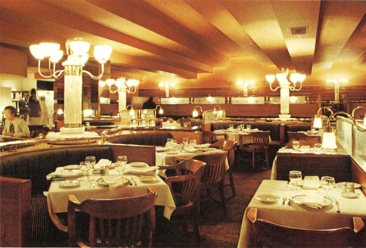 “The main dining room of The Market: the air of a fine restaurant, but strikingly spare and clean. The stepped ceiling planes in pumpkin color add visual interest and deflect sound.”