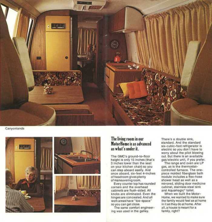 Since the 1950s, motorhomes, or recreational vehicles, had been allowing increasing numbers of owners to indulge—or impose—their love of travel without relinquishing any of the comforts of home. Earlier motorhomes had generally been modified vans or simply a centaur-like melding of truck and caravan, but General Motors’ GMC Motorhome—the first and only motorhome to be produced by a major car or truck manufacturer—was instead a sleek, integrated unit whose radical body design ensured good road handling. At a starting price on its 1973 release of just under $14,000 (almost exactly half of what was at the time the average price of an actual home in the United States) and available in 23- and 26-foot versions, the GMC Motorhome was designed to provide comfortable accommodation for self-reliant tourism.