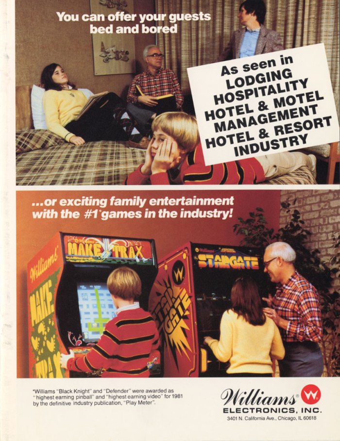 These ads from Williams Electronics, makers of blockbusters Defender and Stargate (released in March and October of 1981, respectively), are a window into an industry that changed the very nature of entertainment and social interaction. Competition was fierce among game makers—revenue in quarters hit $8 billion in 1982, nearly three times the domestic gross of all American films combined—and small business owners had to weigh their options carefully: a lesser known game like Vanguard would cost you less to lease or own than Defender, but Defender would net you more quarters—until the next big thing (Zaxxon, Joust, Dig Dug) landed at the shop next door.