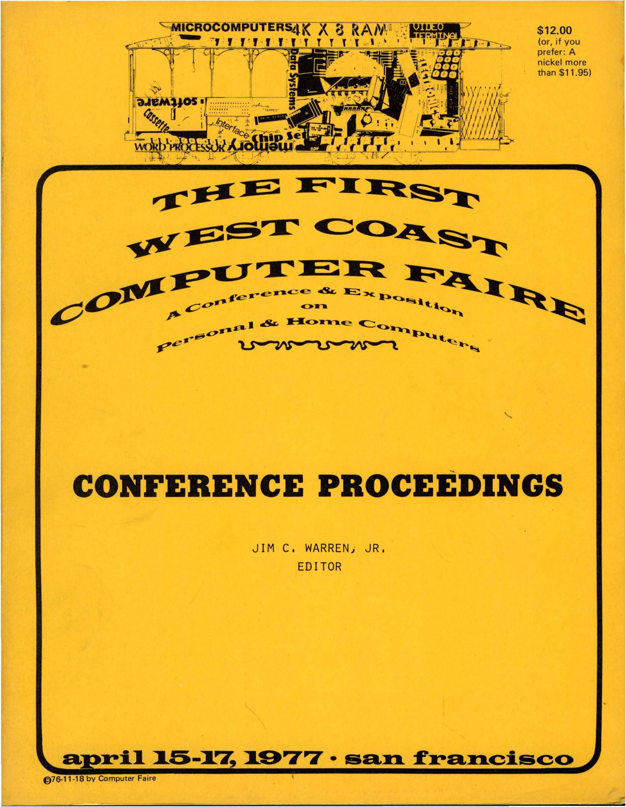 Proceedings of the First West Coast Computer Faire 1977 cover Published May 6, 2019 at 2518 × 3248 in Calling All Computists: The Us Festival in ‘Silicon Gulch Gazette’, 1982 ← Previous Next → Cover of the 1977 West Coast Computer Faire Proceedings. Share this:Tweet