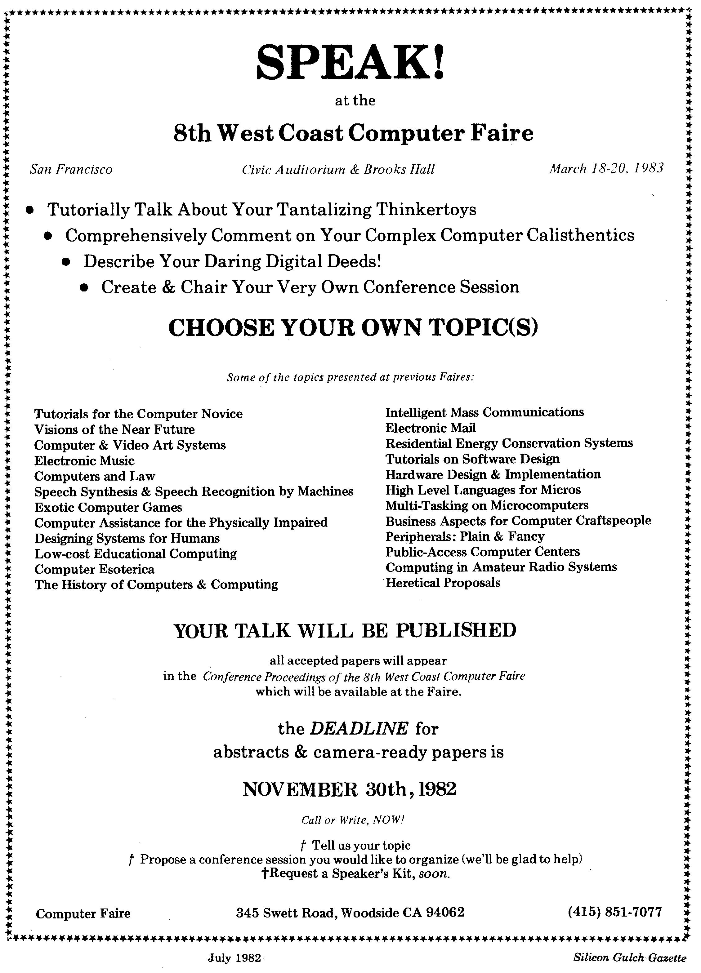 A call for presentations for the 1983 West Coast Computer Faire; check topics like “Computer Esoterica,” “The History of Computers” and “Heretical Proposals.”