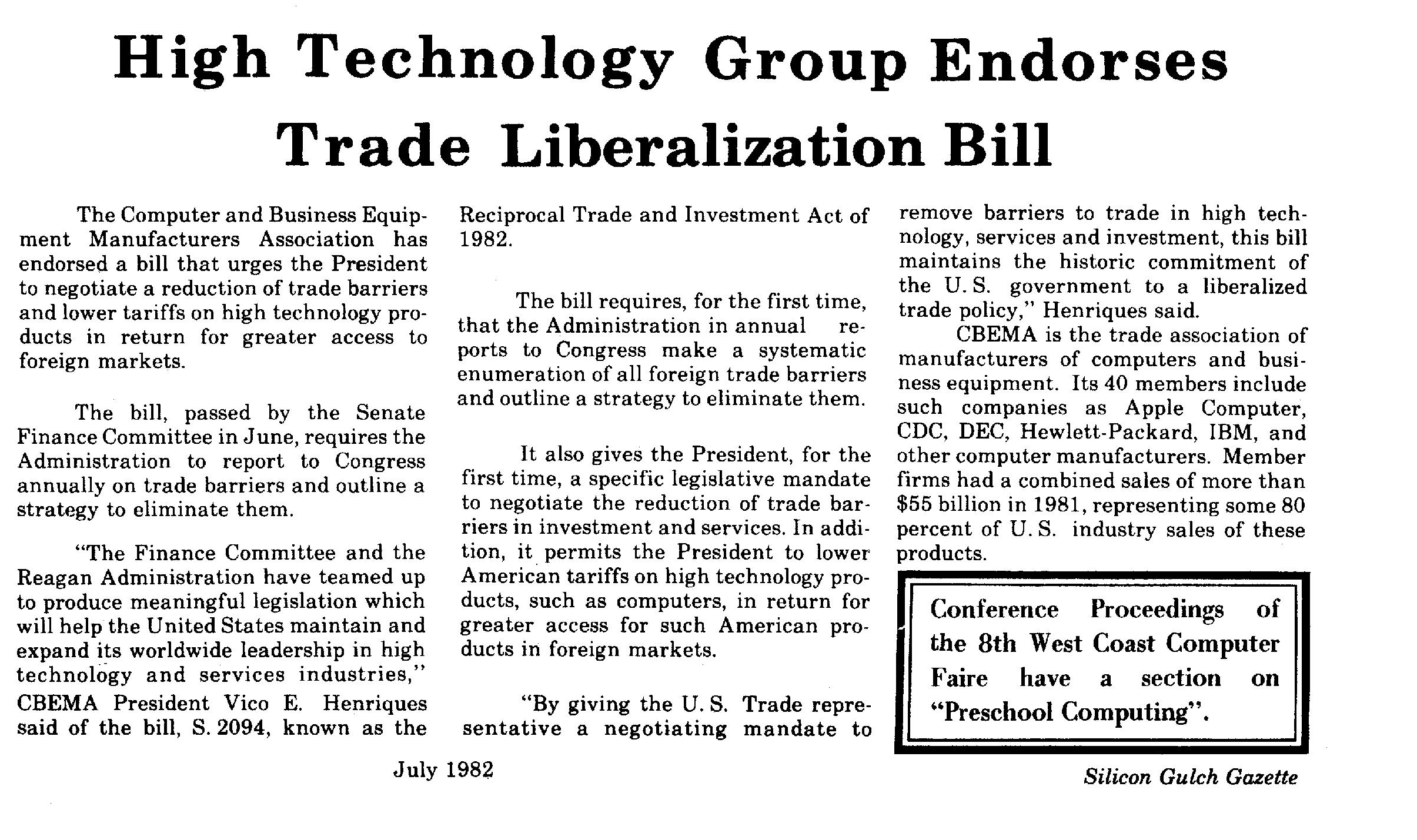 The computer industry took lobbying during the Reagan era of deregulation seriously, with the CBEMA taking Silicon Valley’s concerns about “free trade” to Washington.