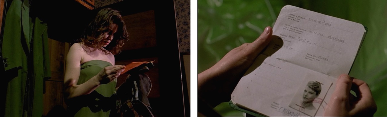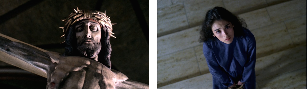 The film teems with associations between the religious identity of characters and religious figures. Early scenes taking place between Ethel and her mother suggest that their family may be of Russian Jewish descent, as the viewer sees a set of Russian dolls in her mother’s bedroom, where she states that she has “…always been a bit meshugganah [the Yiddish slang for ‘crazy’].” When Ethel dyes her hair red later in the film, Lucas tells her that she looks “…like an old Jewish hag.” Ethel does this in the first place, however, to adopt the physical appearance of Lucas’ previous muse, the redheaded Elena (Diane Delor). Her appropriation of Elena’s appearance eventually extends to clothing, which is distinguished by the color green. Throughout the history of New Testament imagery, green was often associated with Mary Magdalene, who is described as wearing green in the gospels (in antiquity, wearing the color often identified one as a prostitute, which is thought to be a possible origin of the song “Greensleeves”). In a scene where Ethel is draped in a green sheet and standing in front of Elena’s jacket—also green—she finds Elena’s entrance visa and passport, which reveal her status as a Czechoslovak citizen. Żuławski establishes a visual association between the color green as an abstract religious image indicating defection from the Eastern Bloc.