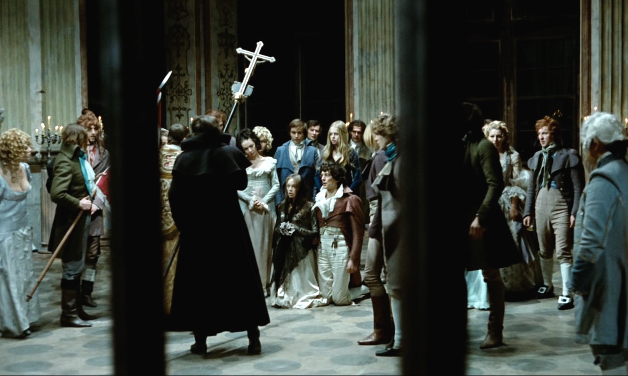 Numerous scenes throughout The Devil refer to the military conflict of 1793 and figuratively to the political conflict of 1968—often by conflating religious rites with armed resistance or patriotism. As Jakub watches a dance held by members of the Polish aristocracy (“…patriotic dances on the grave of an independent homeland”), a priest and flag-bearers intrude and perform an impromptu wedding between an unnamed count (Maciej Englert) and Jakub’s former fiancée (Braunek), also unnamed. The priest states that he and his entourage have come to the dance with the aim of “…saving the miserable, fallen homeland,” equating wedding two people with wedding oneself to one’s nation, or as the film’s dialogue has it, for “…the fate and deliverance of my homeland.”