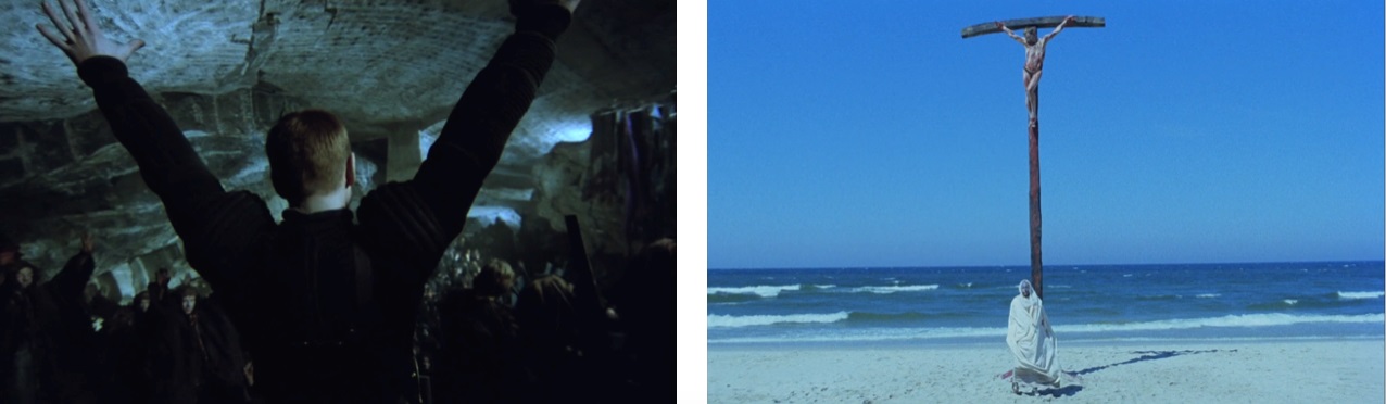 The descendants of Marta (called the “Selenites” in the novels—perhaps a reference to the aliens in H.G. Wells’ First Men on the Moon from 1901—and referred to in the film as the “actors”) are a feral, monk-like society who inhabit underground tunnels, where they have established a de facto “church” and prophecy—namely, that a reincarnation of the Old Man will appear and deliver them from an ancient alien race, called the szernowie (“Sherns”), who are also occupying the planet. When the astronaut Marek (Andrzej Seweryn) arrives to the planet, he is immediately groomed as a “savior” by the inhabitants. After defeating the Sherns, Marek attempts to institute various social and political reforms on the planet, and is eventually executed. Marek’s story arc of course resembles the life of Jesus in the New Testament, particularly as it is written in the Gospel of Luke. (An aspect of Luke that distinguished his book from the other three canonical gospels is its depiction of Jesus as the Son of Man, with greater time spent describing Jesus’ human rather than divine traits.) A monologue in the earliest scenes of the film not only presages the arrival of Marek but suggests the verbiage from Luke: “The father endows him with the seeds of every possibility. What every man nurtures in him will watch it grow in him and bear his fruit. If it is vegetal, he will be a plant. If it is sensual, he will be an animal. If it is intellectual, he will become divine. Finally, if it is intellectual, he will be an angel or the son of man.”