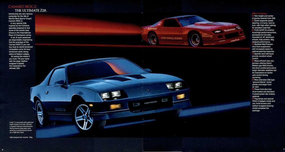 1985 camaro brochure iroc page Published July 1, 2019 at 1200 × 643 in Heartbeat of America: The Chevy Camaro IROC-Z, 1985 – 1990 Next → Introduction of the IROC-Z package from Chevy Camaro brochure, 1985 Share this:Tweet