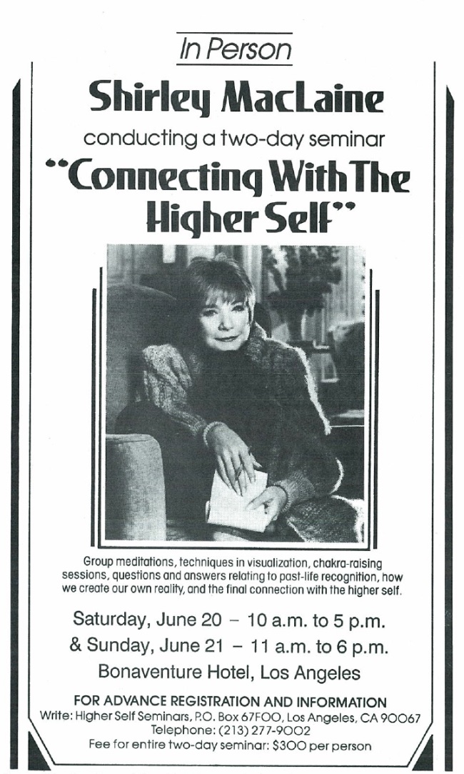 Shirley MacLaine, her own New Age channeling career in full swing in 1987, was one of the many celebrities drawn to the Harmonic Convergence. Ad from Meditation magazine.