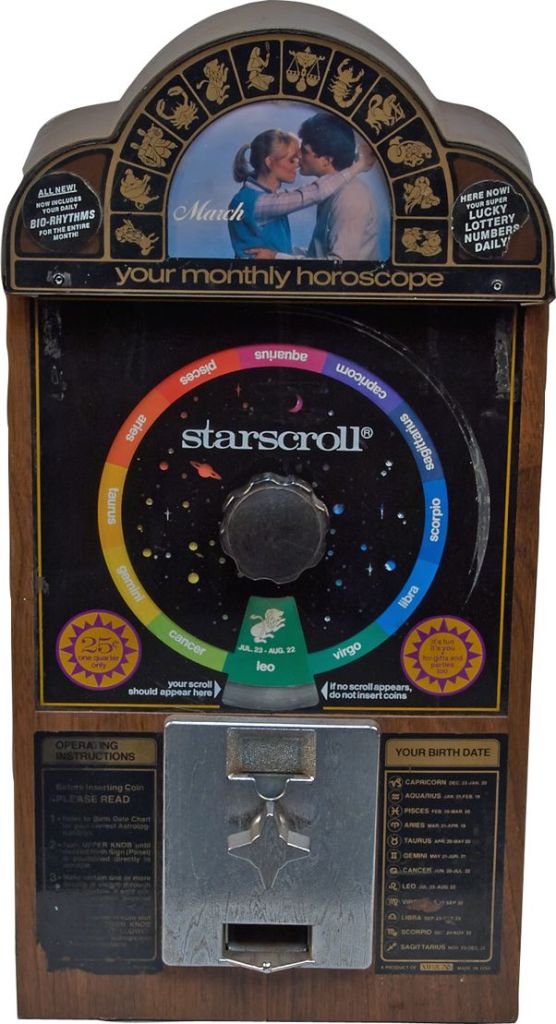 One of the most popular of these retail fortune-tellers was Starscroll, which offered a monthly horoscope, sorted by sun sign, that was displayed for sale both individually (in supermarket check-out aisles) and in visually-striking stand-alone vending machines. Rolled tightly into plastic tubes less than a half-inch in diameter, the individual two-sided scrolls provided astrological information for every day in the month, along with (in later versions from the 1980s) lucky number and biorhythm information as well. The price for all this astrological content? A cool 25 cents (at least during Starscrolls’ ’70s and ’80s heyday).