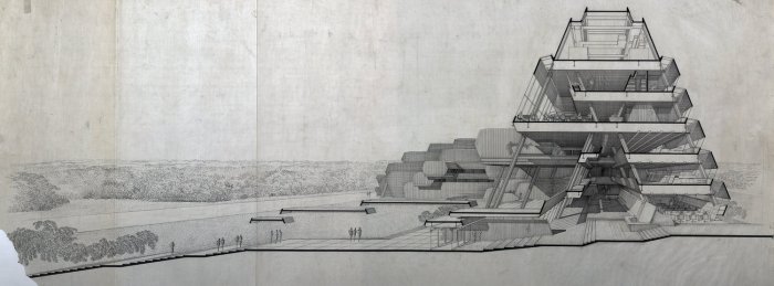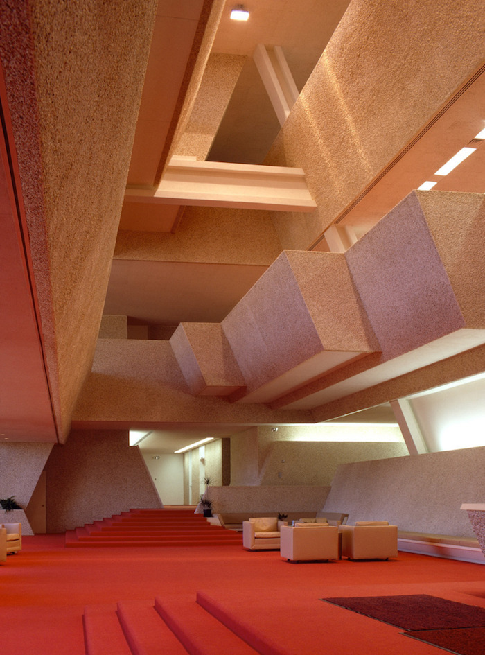 Constructed around a triangular A-frame structure, the three-hundred-thousand-square-foot building was intended to function as a continuation of the sloping ridge upon which it was built, with modular hexagonal pod sections bubbling forth from the building’s main bulk and erupting from one another with an almost organic-seeming lack of order and symmetry, with most of the building’s offices clustered around the cathedral-like three-story foyer that was designed to be the building’s focal point—an effect Rudolph would use again for the atrium of the New York penthouse he shared with his partner Ernst Wagner. In 1982, Burroughs Wellcome commissioned Rudolph to design a 120,000-square-foot annex to extend office space and provide a dining room for the facility’s 500 employees. Testament to the building’s propensity for modular growth, the annex was completed in 1986.