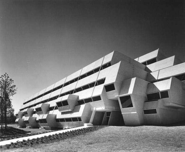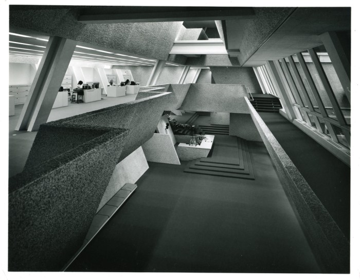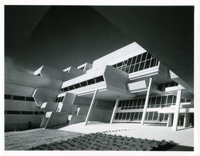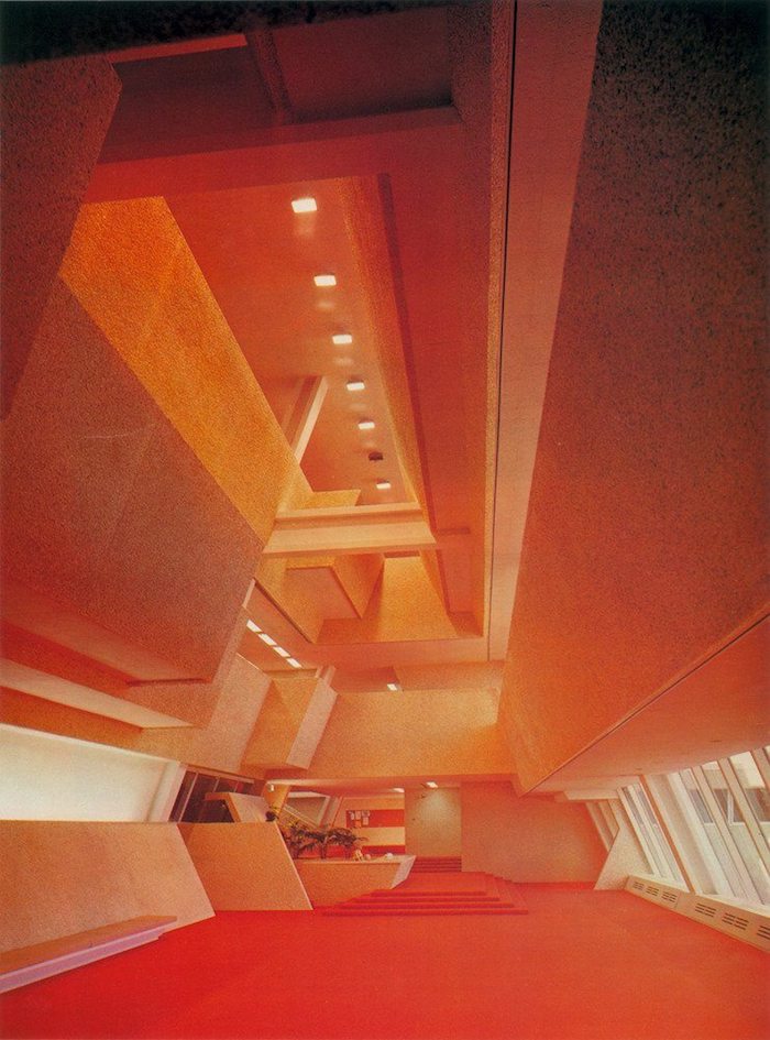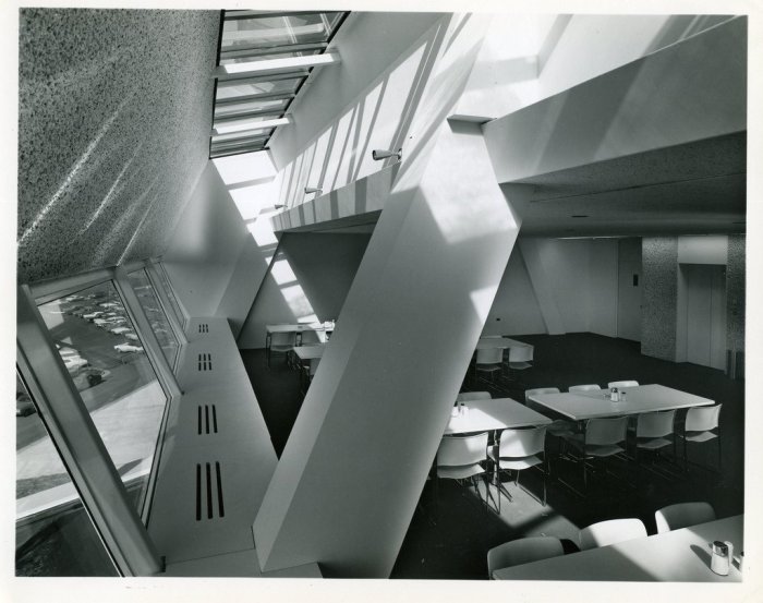 Rudolph had studied at the Harvard Graduate School of Design under Bauhaus founder Walter Gropius, who introduced him to the International Style of architecture, and his previous work included what is probably his best-known building, the Yale Art and Architecture Building, which is considered one of the earliest examples of Brutalist architecture in the US. To Rudolph, an architect was someone “concerned with building meaningfully. As opposed to someone who is interested in building efficiently, or sometimes even beautifully,” and he spoke of the need to furnish buildings with “different kinds of space: the quiet, enclosed, isolated space; the hustling, bustling space, pungent with vitality; the paved, dignified, vast, sumptuous, even awe-inspiring space; the mysterious space; the transition space which defines, separates and yet joins juxtaposed spaces of contrasting character.” The Burroughs Wellcome Headquarters was a perfect embodiment of this philosophy.