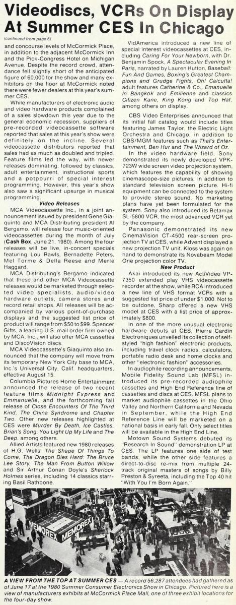 A report from the summer 1980 Consumer Electronics Show in Chicago reveals the kinds of movies being sold on videocassette in 1980: classic Hollywood films, music video features, instructional videos on child care, sports specials, and “adult features” like Emmanuelle.