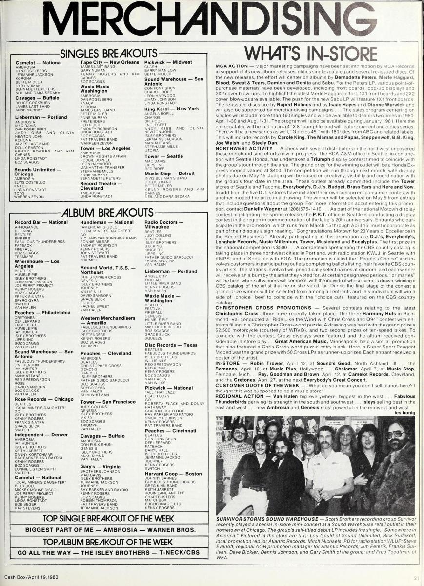 On this typical “Merchandising” page from Cash Box, local record stores from around the country report in on their best-selling singles and LPs; industry promotional efforts receive a write-up on the right.