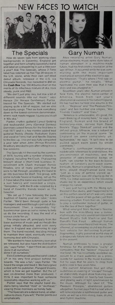 cashbox 1980 new faces specials gary numan Published August 20, 2019 at 836 × 2206 in From the Jukebox to the Joystick: ‘Cash Box’ Magazine, 1980 ← Previous Next → Two “New Faces to Watch” from the UK in the March 1, 1980 issue. Share this:Tweet