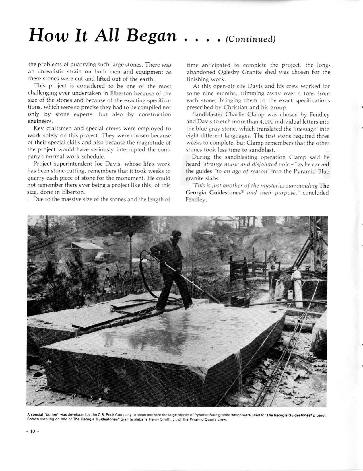 the georgia guidestones 1981 page 10 sandblasting Published November 19, 2019 at 1265 × 1642 in American Monoliths: Local Pride and Global Anxiety in ‘The Georgia Guidestones’ ← Previous Next → The size of the slabs from which the Guidestones were carved is made clear in this photo. Share this:Tweet