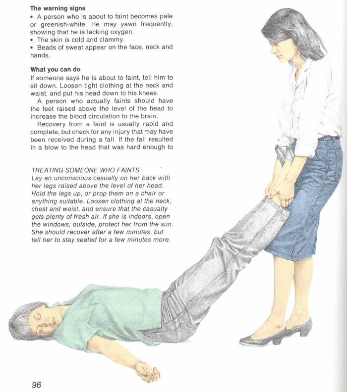In case potential buyers were unsure of the book’s contents, or emergency-tackling owners were worried about being able to identify their copy in haste as they attempted to save someone struck in the head by the yardarm of a yacht or scalded by a hot drink, What to Do in an Emergency featured a cover in innovative hi-visibility yellow with EMERGENCY emblazoned upon it in a clashing magenta, an ensemble clearly meant to evoke the livery of the British emergency services and confer upon it a pseudo-institutional aura of gravitas. To emphasize the tome’s vocation as a vital piece of lifesaving equipment, the book begins with a “rapid action guide” called “When Seconds Count” that covers primary existential threats to Brits—including, natch, chip pan fires, as well as children eating poisonous plants—before the book proper begins. The nine chapters that follow, from first aid and medical emergencies to drink and drugs, contain a number of illustrations so mind-bogglingly vast that only a corporate behemoth like Reader’s Digest could possibly have afforded to fund. These are the book’s true heart and raison d’être.