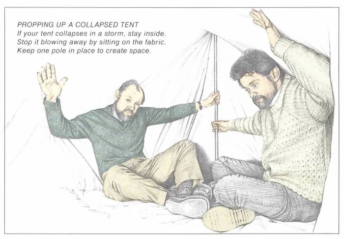 The book’s index—where “blood stains, removal of” sits next to “blocked lavatories” and “vomit stains, removal of” sits beside “volcanic eruptions”—reads like some crazed Oulipolian metafiction. In fact, you could probably make a case for What to Do in an Emergency being one of the more successful modernist horror novels of the 1980s. As well as covering standard British fears like blocked toilets, our ubiquitous chip pan fires, and the quicksand that, to judge by the amount of attention it got throughout the ’70s and ’80s, you would have been forgiven for imagining covered much of the mainland instead of a corner of a small beach in Grange over Sands, What to Do in an Emergency trots out a mindbending litany of horrors: “Menaced by a hitchhiker,” “A sleeping bag can become a dangerous trap,” “poisoned by a crop sprayer,” “Trapped in a bog,” “If you are falsely accused of shoplifting,” “TV fires,” and “If you are swept along by a crowd,” to name but a few. The emphasis is firmly focused on the less spectacular emergencies—surviving a plane crash is given less space than propping up a collapsed tent, for example—and each entry is written in the same voice: superficially calm and in control, but with a terse undertone that hints the writer is struggling to repress a panic attack. It’s not just the entries that are incredible, though—everything about What to Do in an Emergency is incredible, including the names of the illustrators, most of whom sound like people writing local scene reports for late-’80s Maximum Rock’n’Roll: Andrew Aloof, Dick Bonson, Charles Chambers, Ivan Lapper, A.W.K.A. Popkiewicz. The contributing writers are no less remarkable, any random selection of them—say, Dr. Birdwood, Frank Eaglestone, Anthony Greenbank, Basil Booth, and Pippa Isbel—sounding like characters from some half-remembered sitcom.