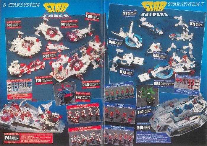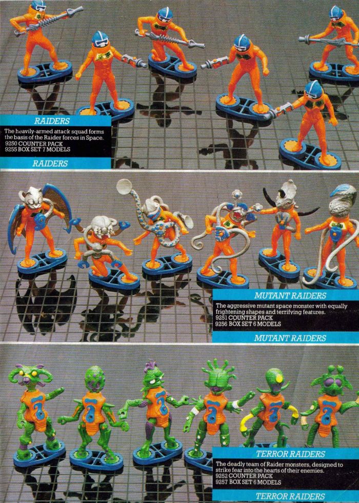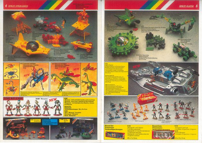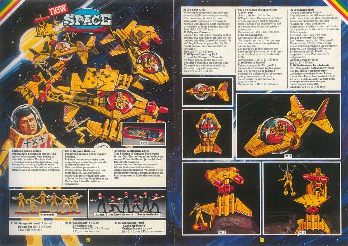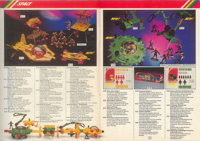 in 1983, I can remember 3 “Toys International” stores in Los Angeles shopping malls… upscale affairs with black walls, lots of chrome display cases and monochromatic, “high-tech” aesthetic flourishes, like a NASDAP-liveried Drakkar Noir toiletry set. Toys International stocked the same Star Wars, Indiana Jones, and Dune toys as other toy stores, albeit at a prohibitive mark up, but supplemented this pedestrian fare with exotic stuff you couldn’t find at Kaybee’s or K-Mart; Playmobil, Meccano, beautiful Tomy robots that could roll around and serve drinks and respond to voice commands. There was a glowing white display case devoted to little Britains lead soldiers in khaki and pith helmets calmly kneeling to gun down rampant Zulu warriors. And medieval knights in red tunics competing in jousting tournaments. No interest to 10 year old me whatsoever. One Sunday afternoon, while I was coveting an elaborate Japanese Gakken robot that transformed from biped to fighter jet with the seeming complexity of 4-dimensional origami, my mom saw a salesperson changing out the Britains case, replacing the dusty Gurkhas with legions of bright yellow Stargards. Very considerately, she grabbed one for me, and it became an oddity in my childhood cigar box full of orphaned Capsela parts, Kubrick-esque playmobil helmets, and Madelman boots. Strapping yellow guy with a bubble helmet and long silver laser rifle festooned with moderne cooling fins. That summer, visiting a mormon uncle in Salt Lake City, a gumball vending machine at a Kentucky Fried Chicken malfunctioned and voided it’s bowels into my little hands; a seemingly endless cascade of temporary tattoos, tiny rubber animals, plastic compasses, pennywhistles, lenticular rings, “nail-through-the-finger” magic tricks, and tiny magnifying glasses. And several neon orange Chinese bootlegs of weird little pink faced Stargards warriors devoid of the metal bases, but compatible with the weapons and helmet of the UK-made figure. I’m convinced that if were to sift through the decades of kipple that follow me from home to home, I still have a tiny Stargards rifle in my possession.