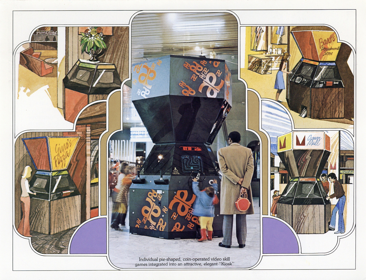 The concept illustrations depicting the Kiosk in the wild—er, excuse me, in “rich sophisticated locations… where children can entertain themselves in a wholesome environment”—are lovely and hint at the house style that Cliff Spohn would develop in the late ’70s. The centerpiece of the page is actually a photo of the Kiosk in the Velizy shopping mall in Paris (the Theatre concept originated with Atari Europe); there was also one that cheered commuters at the BART station on Powell Street in San Francisco. It’s obvious now how utterly impractical the scheme was: no matter how “elegant” the installation, no hotel or department store is going to want to be stuck with it forever, and shipping, moving, and maintaining the massive units could not have been cost effective. What’s more, your quarter bought you only 90 seconds of play—which, to be fair, is probably longer than I lasted on most Zaxxon cabinets.