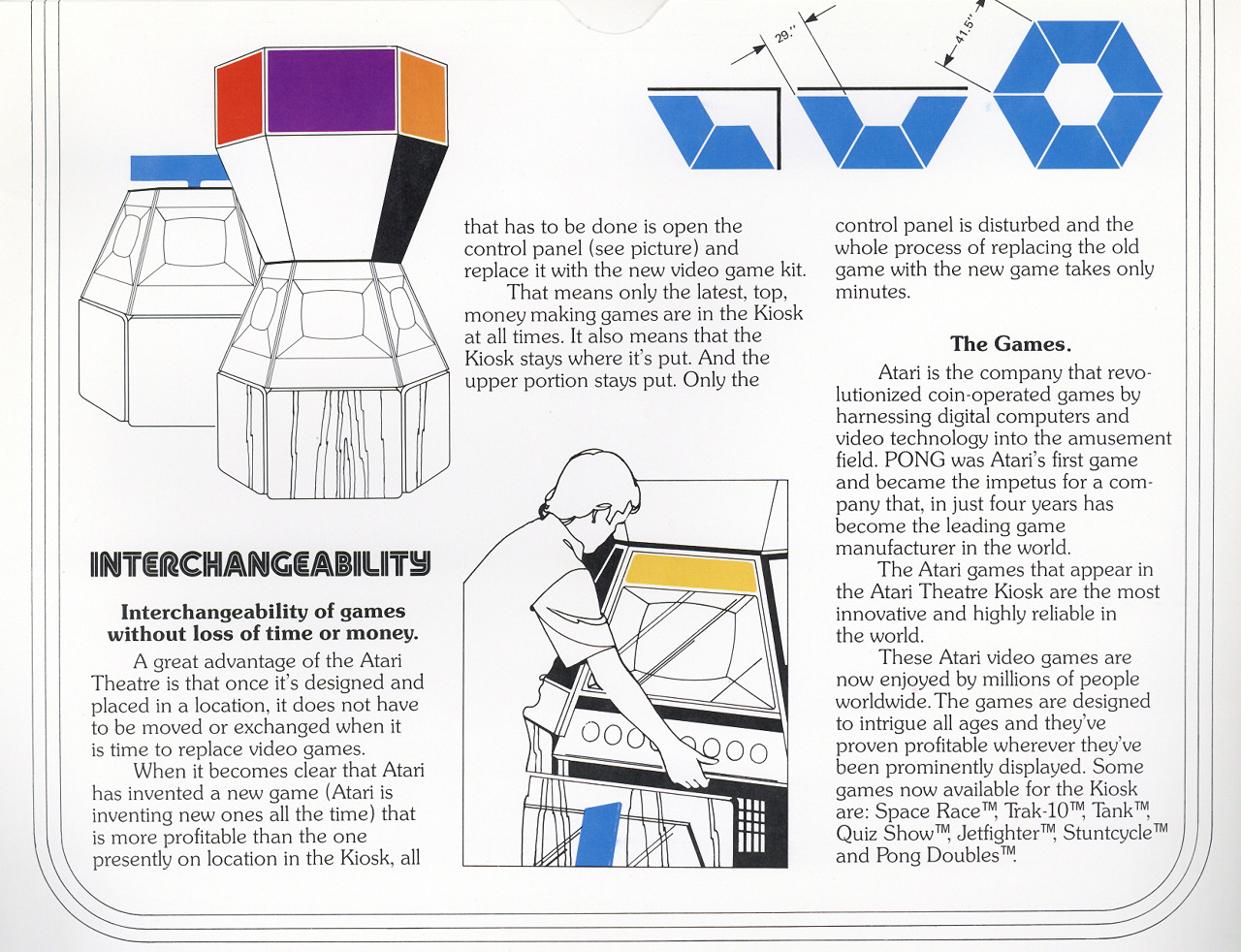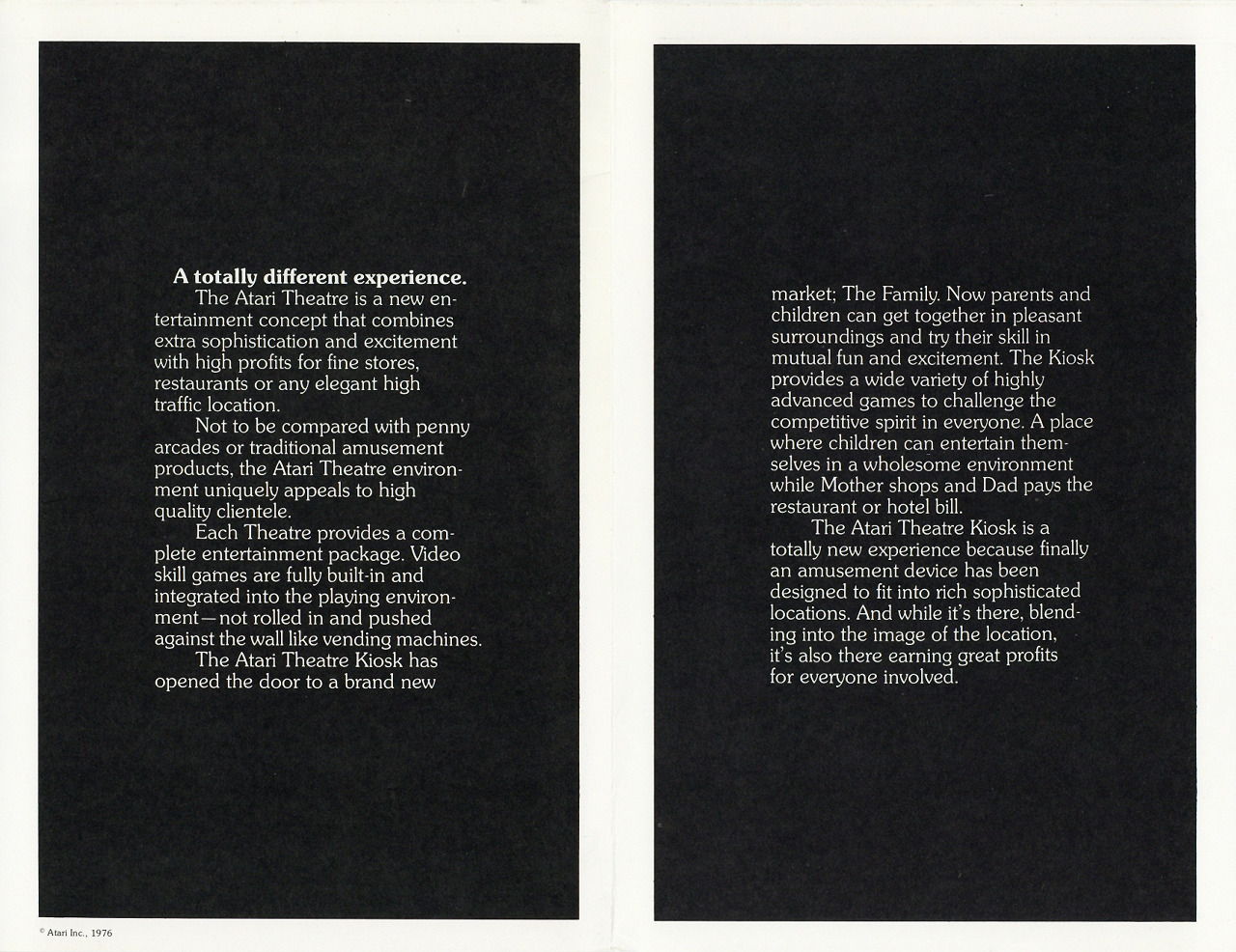 The Atari Theatre Kiosk experiment was short-lived and ill-advised, but the very attempt, documented in this glorious brochure, captures the era’s unrestrained pursuit of what Atari called “innovative leisure.” Produced between the 1975 home release of Pong and 1977’s Atari Video Computer System, the Theatre was billed as an option for “elegant high traffic” locations serving “high quality clientele,” as opposed to the shabby riff-raff then infesting smoke-filled pool halls, penny arcades, and pinball parlors—video arcades didn’t pop up in the States until 1978, when Space Invaders came to town. The very idea of arcade cabinets is presented here as low-class (despite Atari inventing them), mere “vending machines” that had to be “rolled in and pushed against the wall.”
