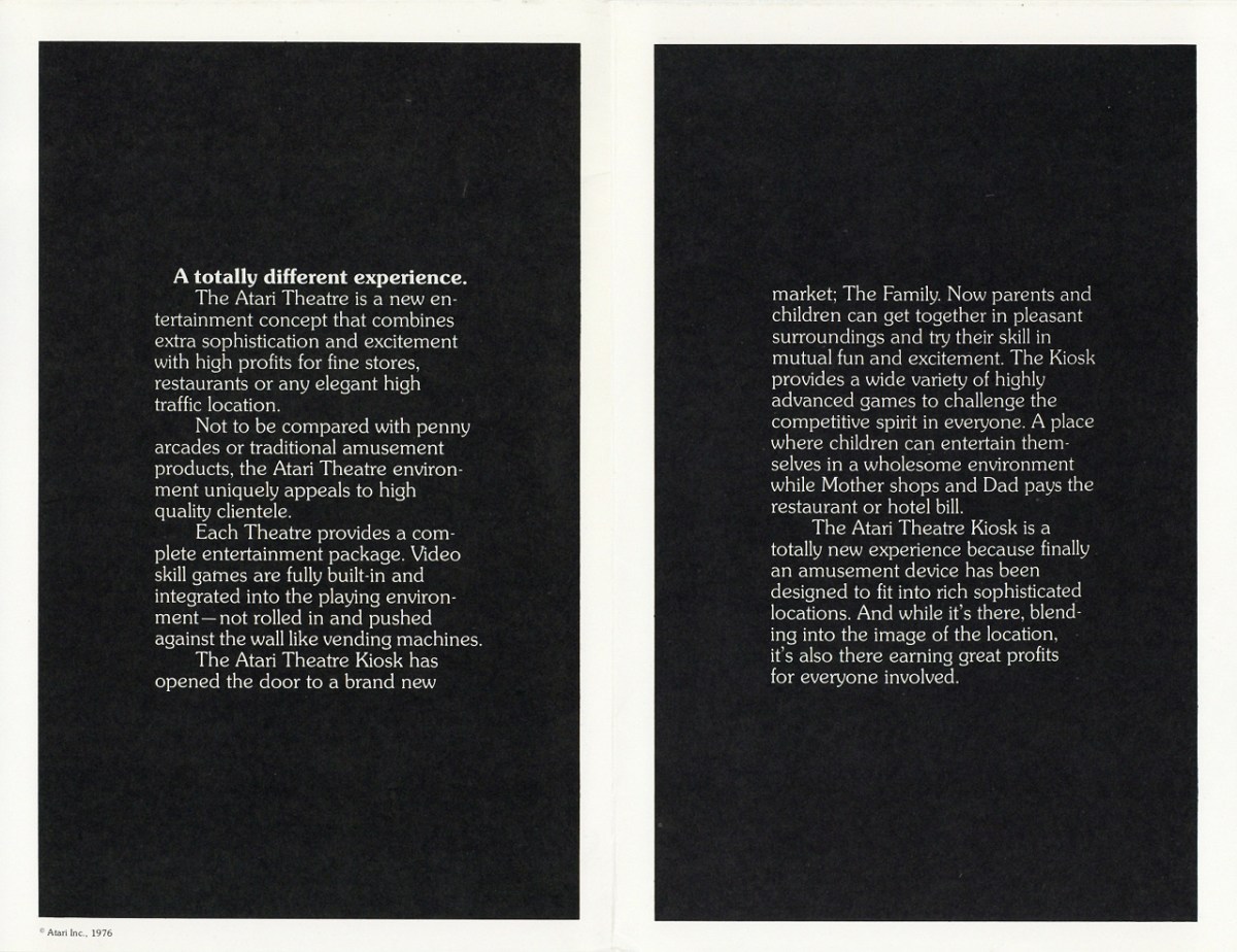 watm atari theatre 3 Published February 24, 2020 at 1280 × 986 in “A Totally Different Experience”: Atari Theatre Kiosk Brochure, 1976 ← Previous Next → Share this:Tweet