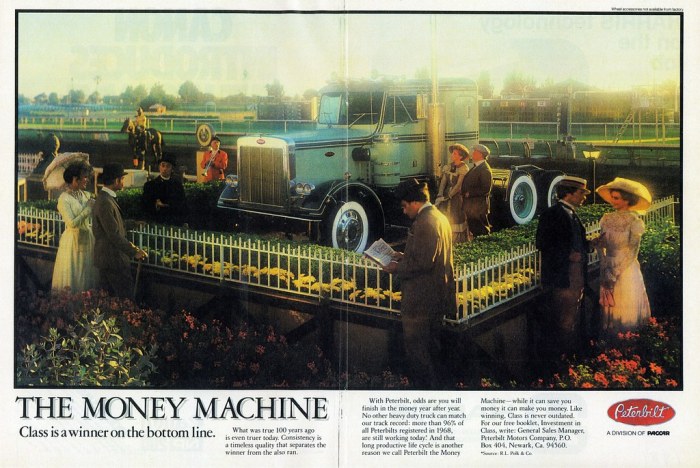 Peterbilt’s publicity of the 1970s seems to speak to an unvoiced desire for elegance, beauty, and romance—the “class” the 1974 ads claimed as the reality of the American dream. Hardly the psychological language we might expect from a truck advert, nor the kind of dream the bullishness of the following decades might imply. Was it perhaps a question of prudery, religious or otherwise, in the upper echelons of the company’s management? Maybe a subterfuge to reach the target audience through its wives? Or was it actually an attempt, conscious or otherwise, to broach women’s changing position in society? We will have to wait for someone more au fait with the ins and outs of the 1970s trucking world to tell us, because I’ll be fucked if I know.