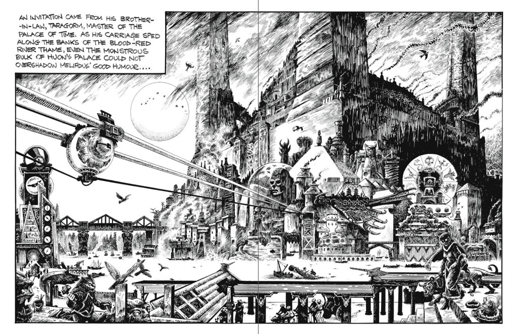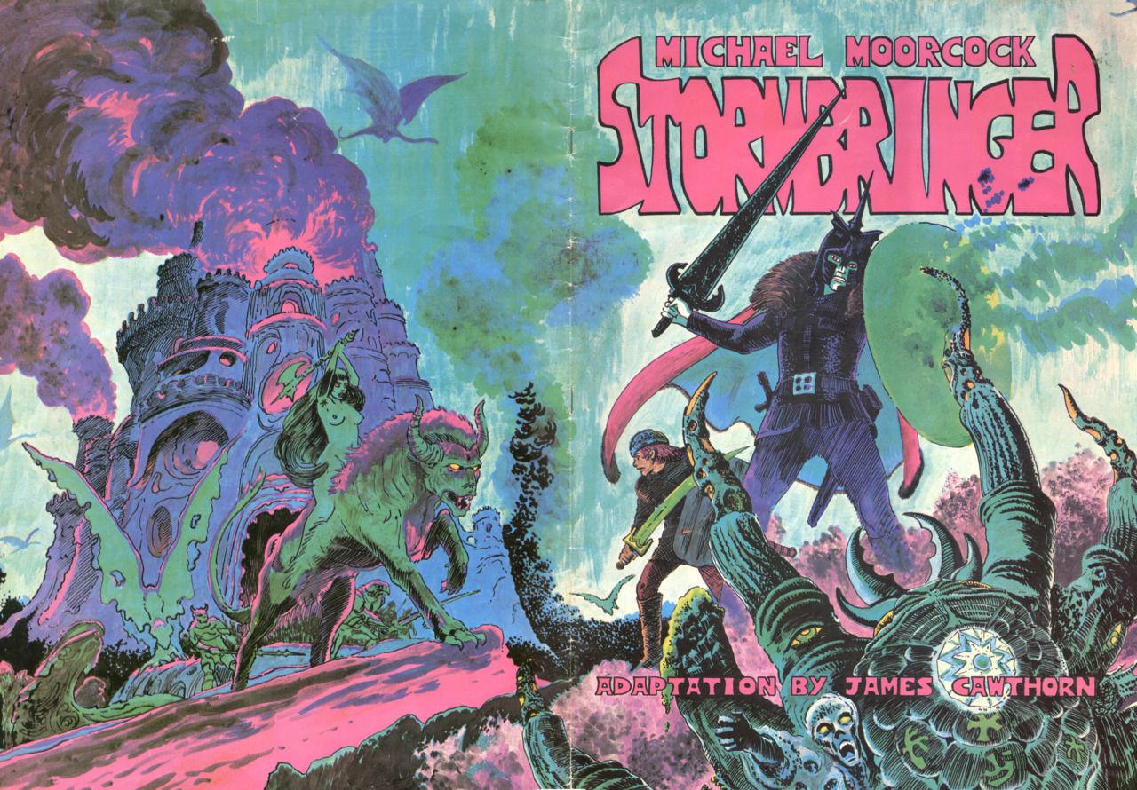 Back in the ’70s and ’80s, Cawthorn was everywhere: the covers of his comic book adaptations of Michael Moorcock’s Elric stories were a fixture on the wall of every head shop, goth shop, comic shop, second-hand bookshop, and pawn shop I entered until I was in my mid-20s, and I’d grown up seeing his illustrations in things like New English Library’s Strange World of Science Fiction, the Savoy Books edition of Moorcock’s The Golden Barge, and the four kids’ sci-fi anthologies that Armada books put out in the 1970s. But, weirdly, it wasn’t until I sat down with this volume that I realized just how deeply his work saturates my own aesthetic life. Which is to say, my life. Not that I’m claiming my aesthetic or actual life are of two shits’ worth of interest to anyone except myself, of course, but it’s a strange feeling to suddenly realize that the blur that’s always been there at the edge of your attention is actually one of the spinning flywheels driving your mind—reminding you how many of those people existing on the margins of the culture remain marginal despite their contributions to shaping it. Cawthorn—who passed away in 2008—is a recognized figure among genre obsessives, but how did someone so interesting and idiosyncratic, who was once so ubiquitous, fall into such relative neglect?