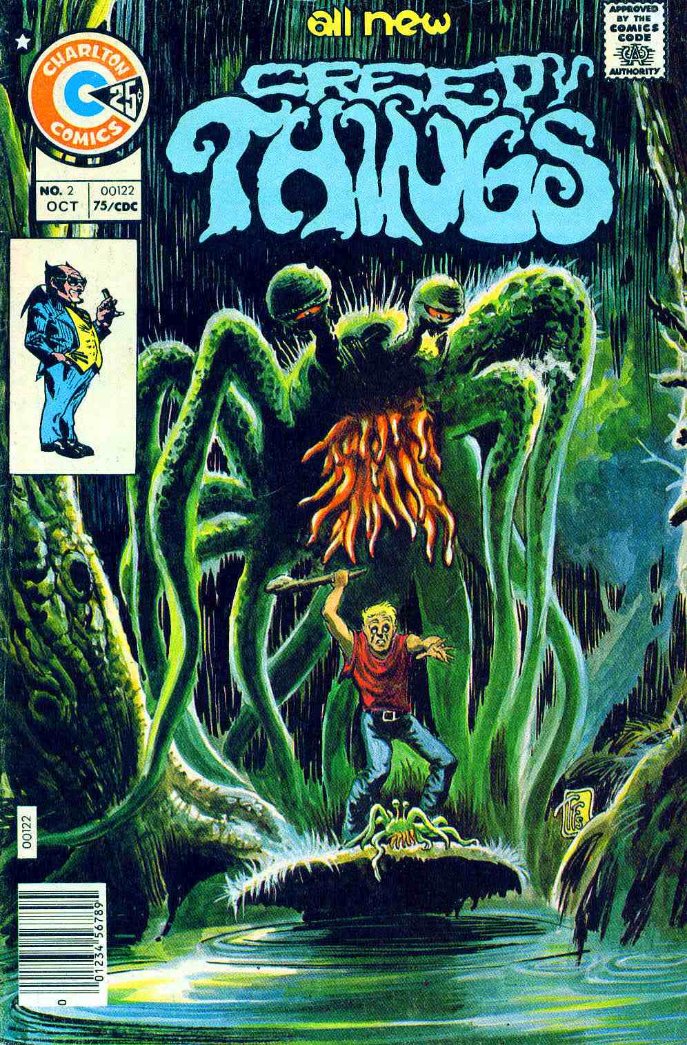 Nature’s unpredictability was marginalized, and this new marginalization bore new phobias. Horror comics like Swamp Thing, Heap, and Man-Thing, films like The Legend Of Boggy Creek (1972), Frogs (1972), Jaws (1975), and Prophecy (1979), and novels by Guy N. Smith, John Halkin, and James Herbert presented situations that spilled out beyond the control of modern society. These narratives were set in places where technology was hard to come by, rural areas steeped in folklore, far from the reach of telephone service, big electrical grids, broadcast signals, and synthetic environmental conditioning. Charlton Publications’ acidic title Creepy Things embodied this new fear of technological deprivation.