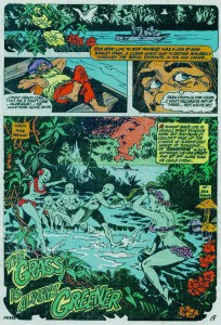 “The Grass Is Always Greener” was the cover story of Creepy Things no. 3, one of a small but powerful selection of Charlton horror tales written by Mike Pellowski. Here we are introduced to Rud Pangley, an obnoxious alcoholic living in a swamp in America’s Deep South. After a “hard” day avoiding work and soakin’ up corn liquor, Pangley stumbles upon a cherubic community of “green folk” frolicking in a cool glade. Clad in bikinis and loin cloths made from tropical blossoms, the hairless, lime-skinned beings enjoy a utopian existence—until one of them strays unwittingly into Rud’s grimy clutches. Overcome by greed and distorted ambition, the sloppy drunk quickly puts together a crude side show that exploits his green captive, whose curious presence, up until this point, was considered to be nothing more than local myth.