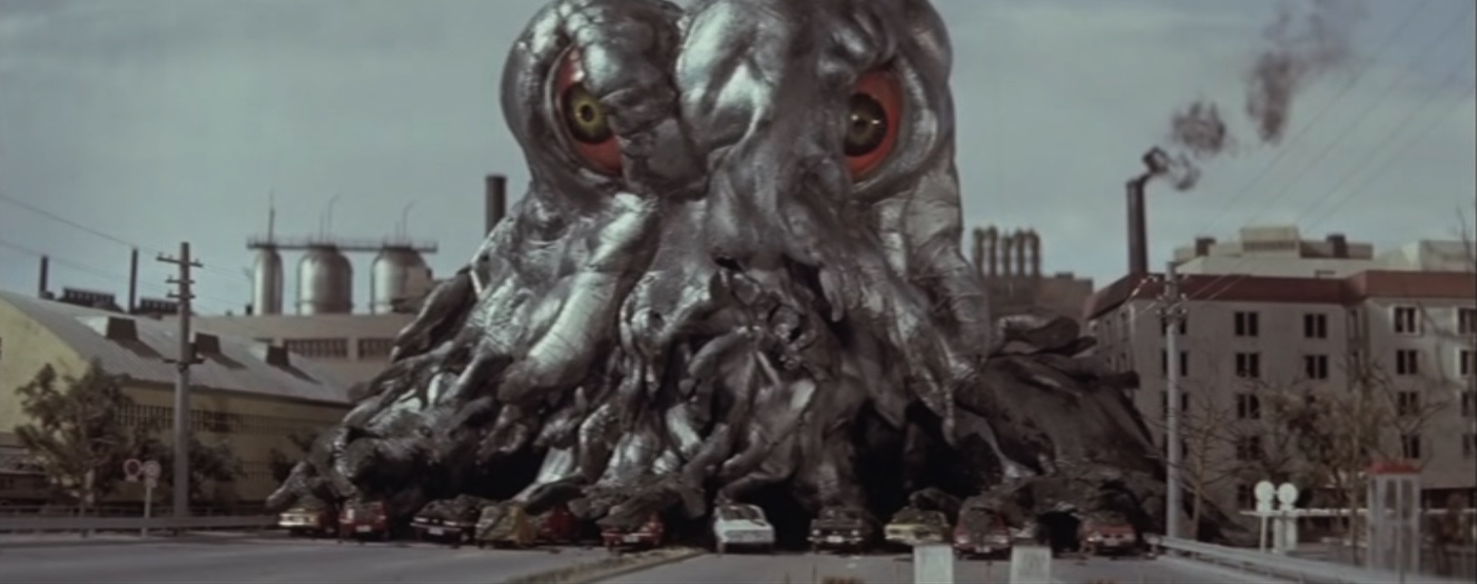 By the 1970s, Japan had been politically rehabilitated after the devastation of the war, welcomed back into the West as a full participant in international capitalism, and Japanese corporations (like their American and British counterparts) had wasted no time getting rich quick and dirty. Industrial endeavors including mining, smelting, petroleum production, chemical refinement, city construction, and more led to near-catastrophic deforestation, contamination of air and water, and at least three man-made diseases: Itai-itai disease, named onomatopoetically after the screams of those who suffered from it, was a debilitatingly painful result of cadmium poisoning; Minamata disease, acquired by eating fish contaminated with mercury, attacked the central nervous system, sometimes causing insanity and death; and the city of Yokkaichi, a center of petroleum refinement, experienced skyrocketing levels of a specific form of chronic bronchitis caused by the release of untreated sulphur dioxide into the atmosphere. By the time filmmaker Yoshimitsu Banno came to create his debut Kaiju picture, Japan was choking on smog.