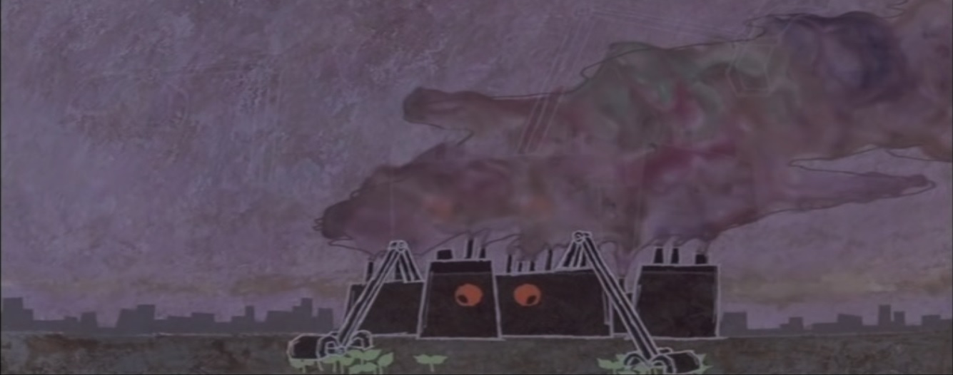 However, even though child protagonist Ken calls Godzilla “a superman” at the start of the movie, the film is unrelentingly pessimistic about the possibility of ever defeating Hedorah for good. For most of the film, Godzilla is simply unable to wound Hedorah, and the beast is only (ambiguously) banished through Godzilla’s cooperation with the military. State institutions are powerless to stop Hedorah, and the counterculture youth who attempt a mass mobilization against the smog monster are unable to imagine any form of resistance to it apart from throwing a party and playing vacuous protest songs. “Why complain about it?” asks the guitar player. “Green pastures exist only in our hearts now. Let’s sing! Let’s dance!”