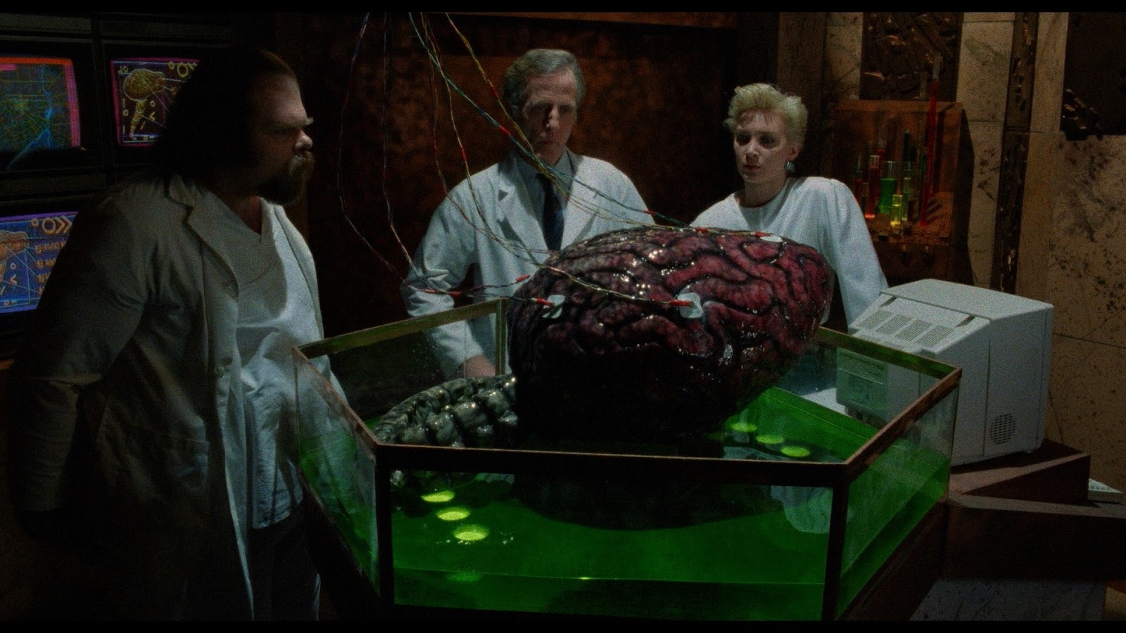 Outside of David Cronenberg’s work and stray oddities like 1980’s The Changeling, the Canadian horror and sci-fi movies of the 1970s and ‘80s often get overshadowed by their counterparts from the US and Europe. Unlike gory scares from other nations, these films reflect the fears of a society deeply impacted and alienated by the goals of close political allies. When viewed through the prism of the Canadian diplomacy that helped diffuse tension during some of the Cold War’s most dangerous moments, America’s patriotic vanity, the remnants of Old World imperialism, and other messy political controversies appear self-destructive and excessive at worst, futile and absurd at best. The 1988 film The Brain presents a grotesque rumination on suburban neurosis, mass media, and Canada’s place in the tangled mass of global politics. A film whose complex special effects, creature designs, dangerous stunts, and high-speed pacing place it a step above many other ‘80s horror works, The Brain is a seamless hybrid of sci-fi adventure and insane spectacle with political symbolism burning at the core of every scene and characterization.