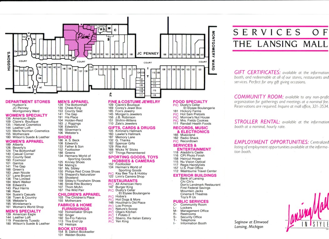 That directory you have in this article is from my local mall. A few years after, they expanded the area by the food court into a smaller new wing anchored by a Mervyn’s (later a Steve and Barry’s and now a movie theater). The Montgomery Ward is now a vacant Younkers, Hudson’s, a vacant Macy’s. The only anchor left is the JCPenney.