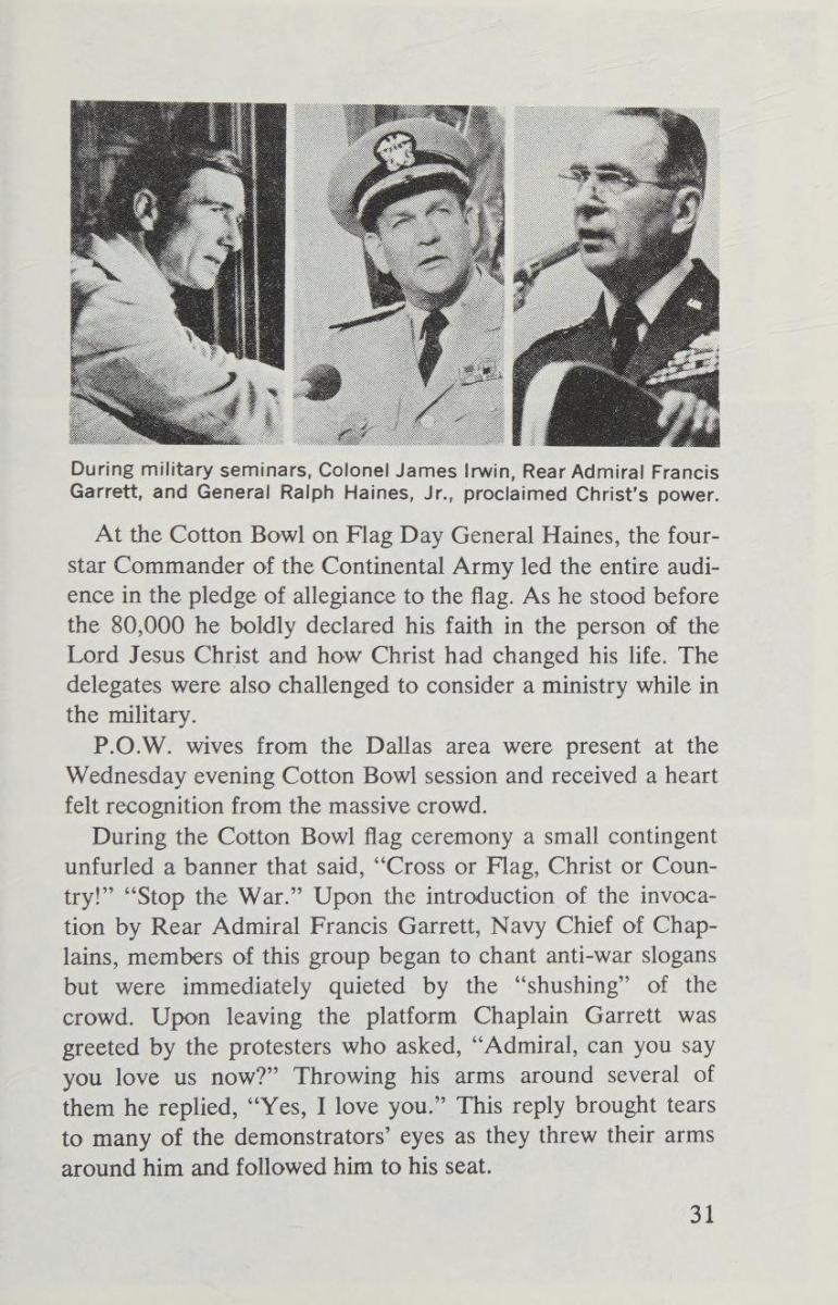 explostoryplanto0000eshl_0045 Published January 12, 2024 at 850 × 1323 in Truckin’ for Souls: Explo ’72 and the Jesus Revolution ← Previous Next → Militarism was explicitly folded into Explo’s mission; peace activists on the grounds of the gathering were ostracized. Share this:Tweet